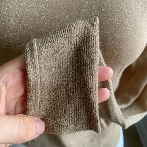 Beautiful nude–khaki tone knit turtleneck featuring subtle metallic gold threads woven throughout the fabric. The shimmer effect is elegant and refined — not overly flashy, just a soft glow that elevates the piece.