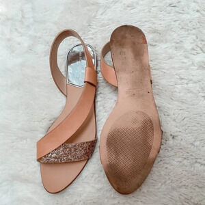 Worn once before realizing they’re too small. Size 37, is more like a 6 1/2. See wear on sole and slight glue patch on gold glitter that’s not visible when worn.