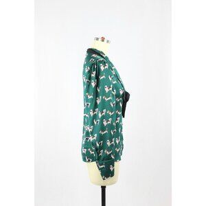 ZARA Green Dog Print Satin Oversized Collared V-Neck Tie Blouse, Size S