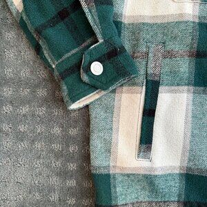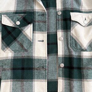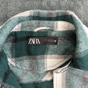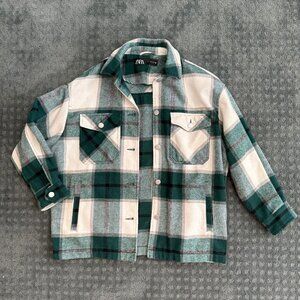 This stylish ZARA plaid shacket features a green, white, and brown check pattern with a cropped fit — perfect for layering through every season. The soft, mid-weight fabric makes it a great transitional piece, easily styled over a t-shirt or sweater.