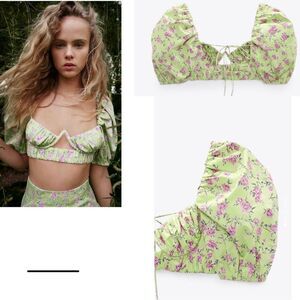 ZARA Green floral flower print puff sleeve crop top Sz L NWT
