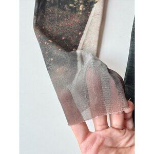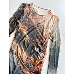 ZARA Grey Beige Landscape Print Mesh Long Sleeve Ruched Maxi Dress, Size M
