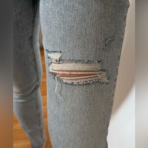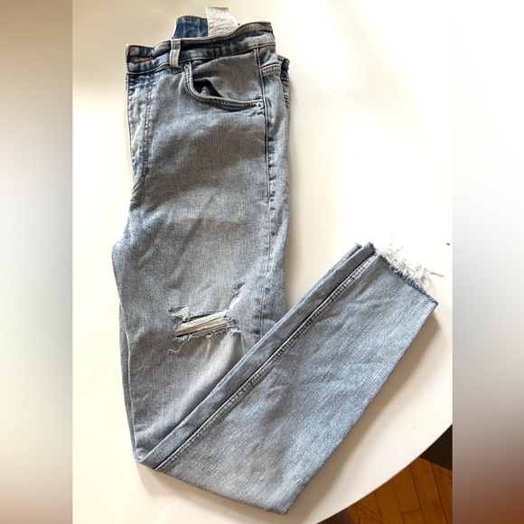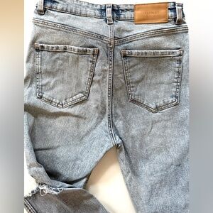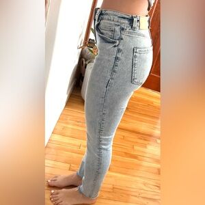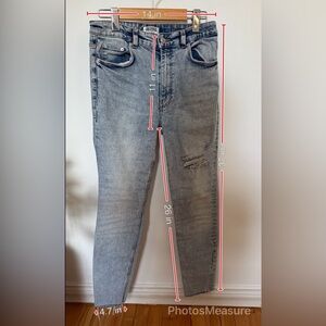 Trendy high-rise skinny jeans from Zara in a light blue wash. Features a distressed rip at the knee and raw hem for a laid-back, casual look. Super flattering fit with stretch for comfort. There are some fringes at the ankle. See last photo for measurements.