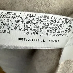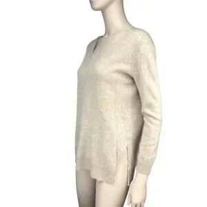 Luxuriously soft v-neck sweater crafted from 100% cashmere in a versatile oatmeal beige heather. This Zara Knit piece features a relaxed silhouette with high side slits at the hem for ease of movement and a modern drape. The fine-gauge knit and ribbed trim at the cuffs and hem provide a classic, refined finish suitable for layering or wearing on its own.