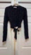 Round neck long sleeve sweater. Tonal pearl appliqués and open back with tie.