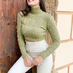 Luxurious semi-cropped knit pea green crop sweater with pearl detail on front AND back π€©