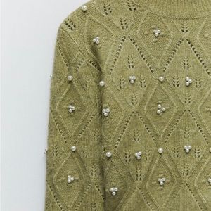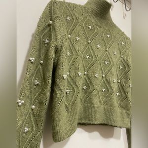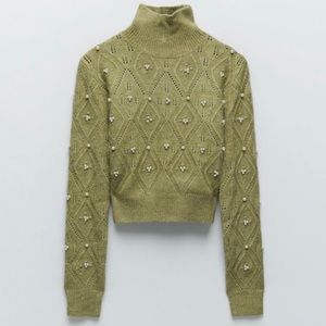 ZARA Knit Pea Green Pearl Turtleneck Crop Sweater, Size Medium