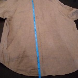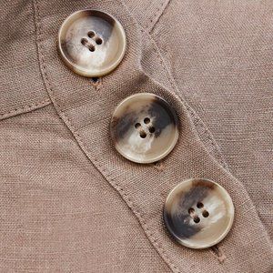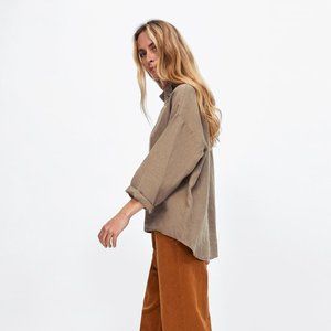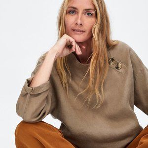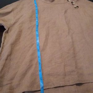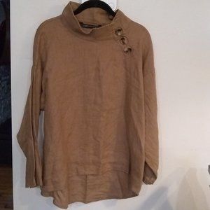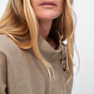 Linen top featuring a funnel collar and long loose sleeves. Fastens with buttons on the side of the neck.