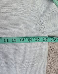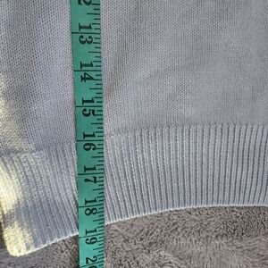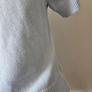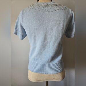 Adorable lightweight blue sweater with beading around the collar. Short sleeves. slightly cropped. Relatively lightweight.