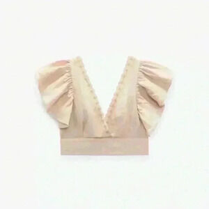 Beige Ruffle Sleeve V Neck Crop Top