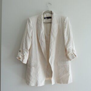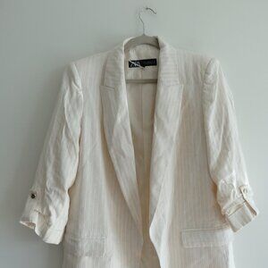 ZARA Linen Blend Neutral Oatmeal Stripe Roll Tab Sleeve Blazer - Women's Size M