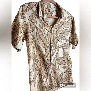 Zara men’s Large short-sleeve Summer shirt, cream background with brown palm fronds… it’s a casual more discreet/neutral Hawaiian-type vacation shirt.