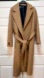 Wool coat. Lapel collar and long sleeves. Front welt pockets. Back vent. Matching fabric belt.