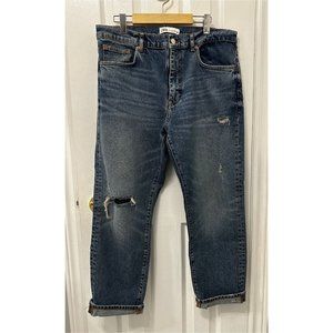 High-waisted five pocket jeans in rigid fabric. Ripped detail. Front zip