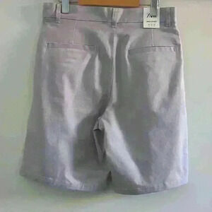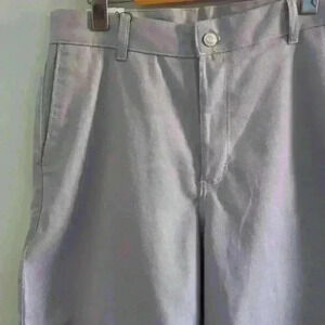 • Style: Light lavender with multicolored speckles throughout material, two slanted front pcokets, two slits on back to look liek pocket, button and zipper closure, belt looks, Wide leg, short fit, stretchy