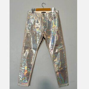 ZARA Metallic Mid-Rise Slim Denim Jean Holographic Iridescent Pink Silver Disco