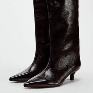 Wide shaft with faux patent leather effect. Kitten heels. Pointed toe.
