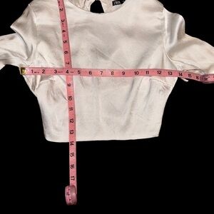 Zara corset back satin-like blouse. Dressy, open back style with long sleeves and single button at neckline. Lightly textured, off white fabric lends a sense of formality to this cropped blouse