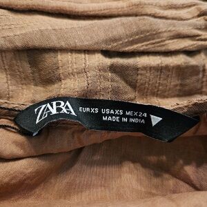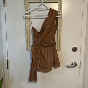 ZARA | One Shoulder Striped Beaded Dress Top Shirt Brown 100% Cotton