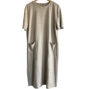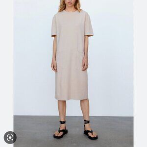 ZARA Women's Oversized Neutral Taupe Short Sleeve casual dress - the perfect blend of contemporary minimalist style and comfort for your capsule wardrobe. This dress features a scoop neckline and 2 patch like pockets on the front. Its oversized sheath tunic design is both stylish and utilitarian. This dress is comfortable to wear and the midi length is easy to move in. The neutral taupe colour makes it easy to pair with any accessory. Wear this with a jean jacket or belt to elevate the look from day to night. Size L. In very good pre-owned condition