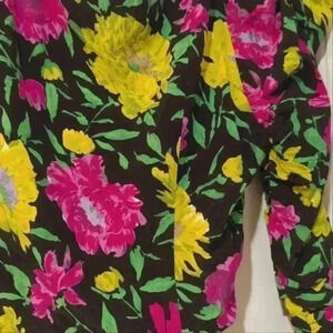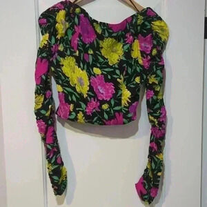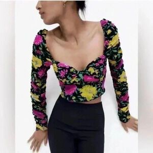 Details: • Brand: Zara • Market: Women’s • Size: Small • Colour: Yellow/Green/Black/Pink • Style: Pullover with hidden side zipper, ruched long sleeved arms, • Material: 100% viscose Lining: 100% polyester, floral design, square neck with slight V in chest • Measurements: Length across chest 15.5", height from shoulder to bottom 14.5" • Condition: New w/out Tags *Same day or Next day shipping (excluding holidays & Weekends) 18O