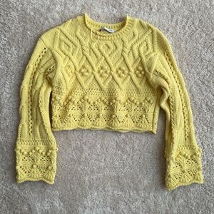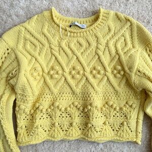 ZARA Pom Pom Knit Openwork Crocket Cropped Sweater Womens Yellow Size L Large