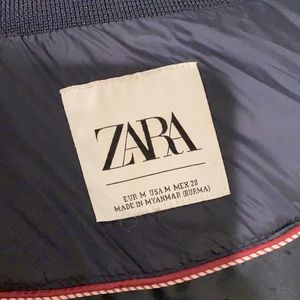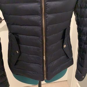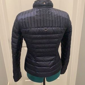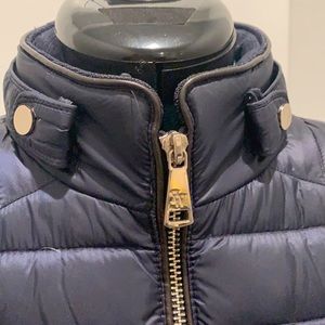 Ladies fitted puffer jacket, Useful for fall through to spring, elastic side panels, eye catching collar details, very good condition, beautiful navy blue colour, burgundy accents in lining, smoke free household