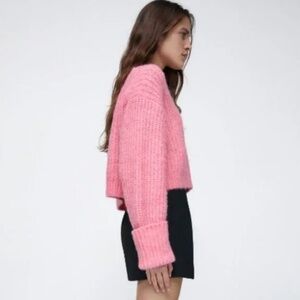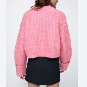 This cozy Zara Fuzzy Knit Cropped Sweater in a vibrant bubblegum pink hue is the perfect balance between bold and comfy. Featuring wide, relaxed sleeves with ribbed cuffs, this cropped sweater brings a playful yet chic vibe to your wardrobe. Ideal for cooler weather or a cozy night out, its soft fuzzy texture elevates any outfit with a pop of color.