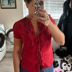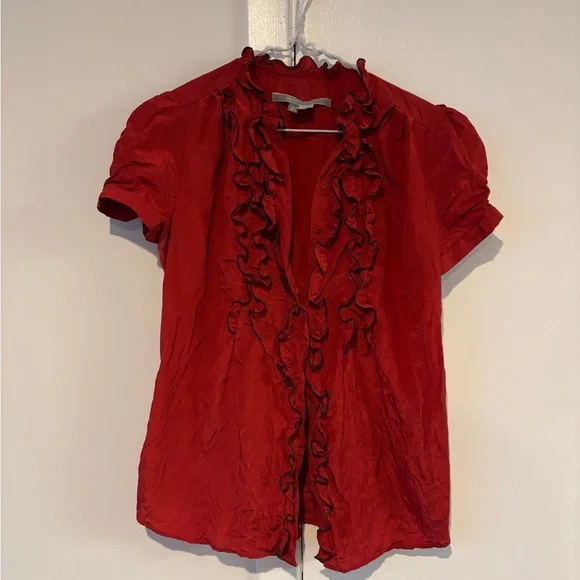Classy, vintage style red short sleeve button up top with ruffles.