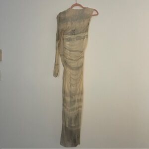 A statement piece that turns heads from every angle. This ZARA one-shoulder maxi dress stuns with its sheer mesh overlay, tie-dye wash in earthy neutrals, and artful ruched draping throughout. The single long sleeve and asymmetrical neckline add an architectural edge, while the bodycon silhouette hugs in all the right places. Fully lined with a back zip for a seamless fit, this dress is the ultimate mix of bold and ethereal.