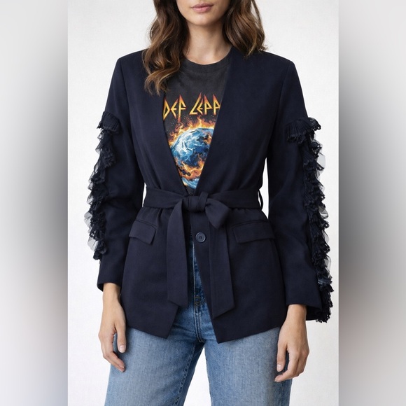 Make a statement with this stunning Zara Basic blazer featuring ruffled tulle sleeves and a sleek tie waist for a flattering silhouette. The open neckline and single-button closure add a modern touch, perfect for pairing with a camisole or blouse. Fully lined for comfort and structure. Pockets still stitched