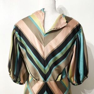 ZARA STRIPED CHEVRON SATIN SHORT PUFFY SLEEVE MAXI SASH BELTED DRESS, a 70's inspired muted turquoise olive green pink yellow and black striped chevron pattern long sleeve satin maxi dress with a sash that ties up in the back - round neckline - half puffy sleeve with an elastic cuff - not stretch - size zipper closure - flowy and lighweight, perfect spring and summer formal day to night dress for a wedding, first date, marriage , easter party, anniversary, birthday party and more. Versatile, original - modern-boho style.
