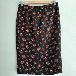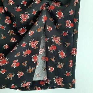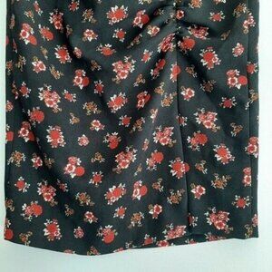 • Fun side ruched skirt in black with red and burnt orange ditsy flower print. Back zipper closure.
