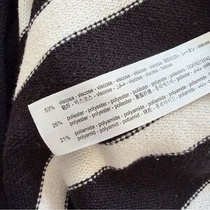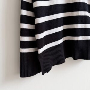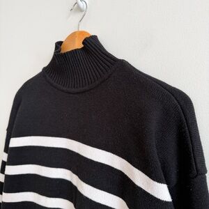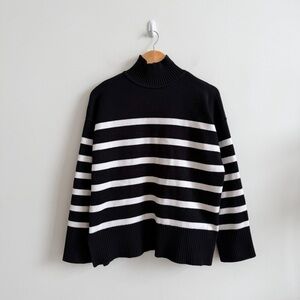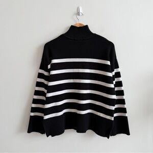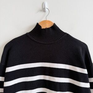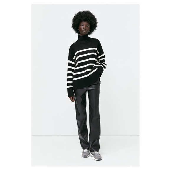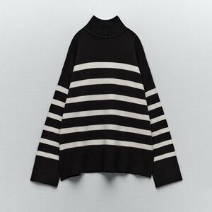 This Zara striped knit sweater is the perfect elevated basic for cooler days. Features a soft mockneck, bold black-and-white horizontal stripes, and an oversized slouchy silhouette that drapes beautifully. Finished with ribbed cuffs and hem plus side slits for easy movement.