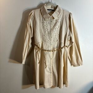 ZARA Sz L Collared Cream Shirt Dress Eyelet Lace Front Puff Sleeves Beaded Belt