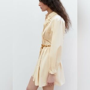 ZARA Sz L Collared Cream Shirt Dress Eyelet Lace Front Puff Sleeves Beaded Belt. This elegant cream shirt dress features intricate detailing and a stylish belt. Perfect for any occasion, it offers a blend of comfort and sophistication. Boho. Bohemian. Fresh and sassy. Feminine and fun.