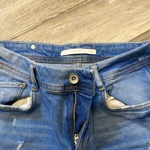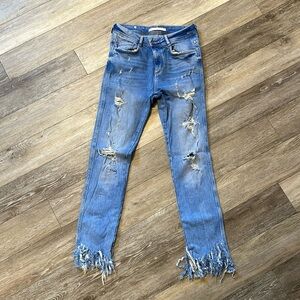 ZARA TRAFALUO | Denim Distressed High Rise Skinny Jeans with Fringe Hem