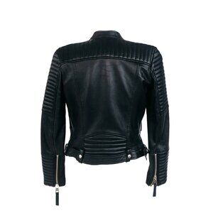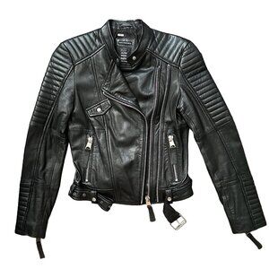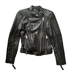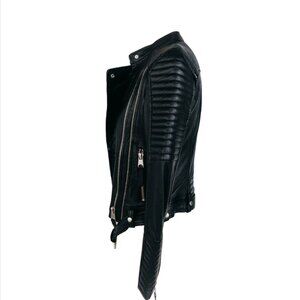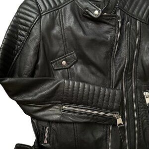 🔥 Timeless, edgy, effortlessly cool and sleek this black soft genuine leather moto jacket from Zara’s TRF collection is a classic staple for any wardrobe. Features silver zipper details with leather pull tabs, quilted shoulder and sleeve panels, and an adjustable belted waist for a flattering fit. Asymmetrical front zip closure and full lining add to its edgy, premium look.