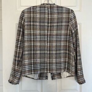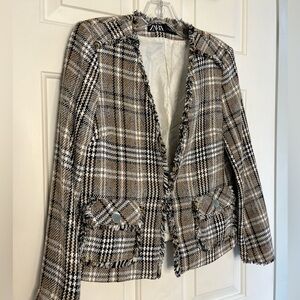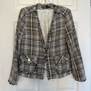 ZARA Tweed Frayed Plaid Blazer Cropped S