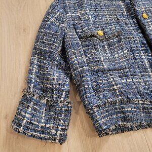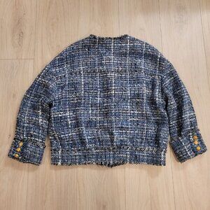• Loose tweed style fabric with distressed trim and plaid pattern