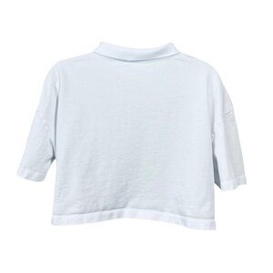 This white cropped polo top from Zara is perfect for a casual and trendy look. Made from a soft, stretchy blend (95% cotton, 5% elastane), it offers optimal comfort. The loose fit and cropped hem create a modern, relaxed silhouette. It's ideal for summer and easy to pair with high-waisted jeans or shorts.