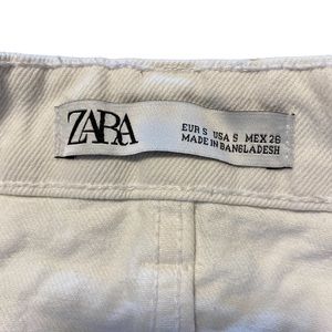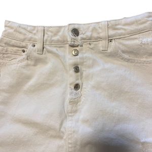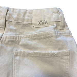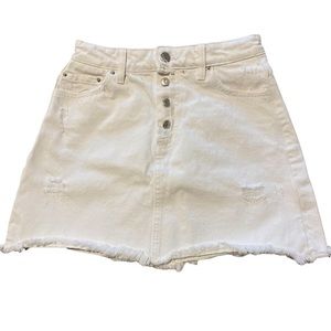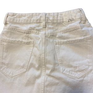 Size small ZARA white denim mini skirt. In excellent pre-loved condition with no visible flaws or stains other than the distressed denim which is the style.