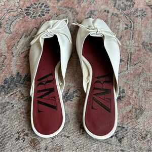 Chic ZARA slip-on mules in soft white leather with a unique lace-up detail and modern square toe. Burgundy insoles with ZARA logo, flat heel, easy slide-on style—perfect for minimalist outfits, trousers, jeans, or dresses.
