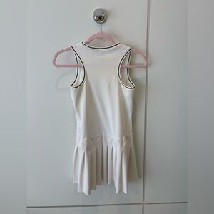 Crisp white Zara sleeveless tennis-style dress featuring a sporty-chic silhouette with a pleated skirt and contrast black trim at the neckline and armholes. Made from a smooth, stretchy performance-style fabric that’s comfortable and easy to move in.