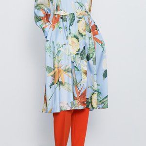 ZARA Woman's Belted Printed SHIRT Dress Light Blue Floral w/Pockets