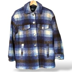ZARA Wool Blend Blue Plaid Fully Lined Jacket / Shacket w/ Pockets US Sz S