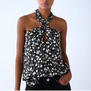 ZARA black and ivory satin easy care halter top