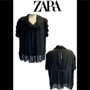 ZARA black chiffon Cowell neck short sleeve gathered blouse Sz M