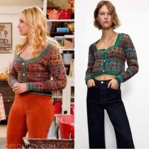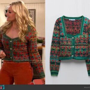 Zara Jacquard Cardigan fuzzy knit green red sweetheart neck Sweater blogger favorite Blogger Favorite Jacquard knit Cardigan! Cozy fuzzy knit Sweetheart neckline Green red print Acrylic polyester polyamide Machine wash delicate cycle cold SIZE medium