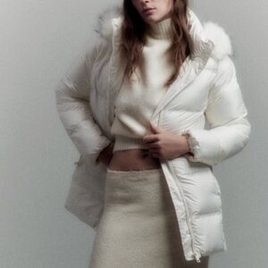 ZARA ecru off white removable hood water and wind protection puffer winter coat new without tags. Fitted winter jacket with high collar and removable hood with removable faux fur trim, long sleeves with elasticized cuffs, front pockets with interior lining and zip closure, front zip closure, faux down, very light and warm. This coat is gorgeous in person, pics don’t do it justice, strong clean girl quiet luxury vibe. Brand new, label was removed but never worn. Colour is accurate in the stock photos, mine are taken in artificial light (it's more of a white than an ecru in my opinion). Marked size L Large. All measurements are approximate and taken with the garment laying flat : Shoulders 18’’, Armpit to armpit 20", Waist 18’’, Sleeve from shoulder 24’’, Total length 31". This item comes from a smoke free, pets friendly home. Recycled bags/box used when possible. Please, let me know if you'd like any additional info. Thanks for watching!